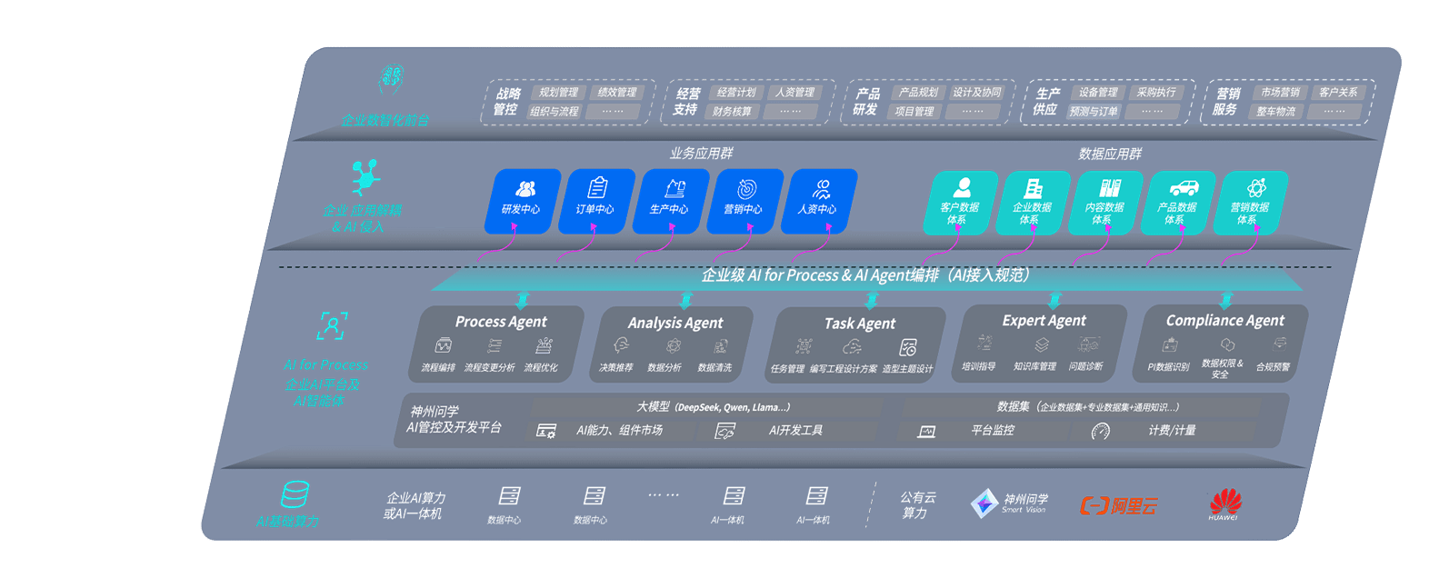 端到端的一站式AI工作空间深度融合了从企业战略规划到日常经营的全流程业务板块,,,,定向解决车企内部领域多、、、部门多、、、、链条长、、、、场景碎片化等难题,,,支持车企快速构建以AI为核心的生产力写作体系,,,,实现任务执行与AI能力的无缝集成与交互