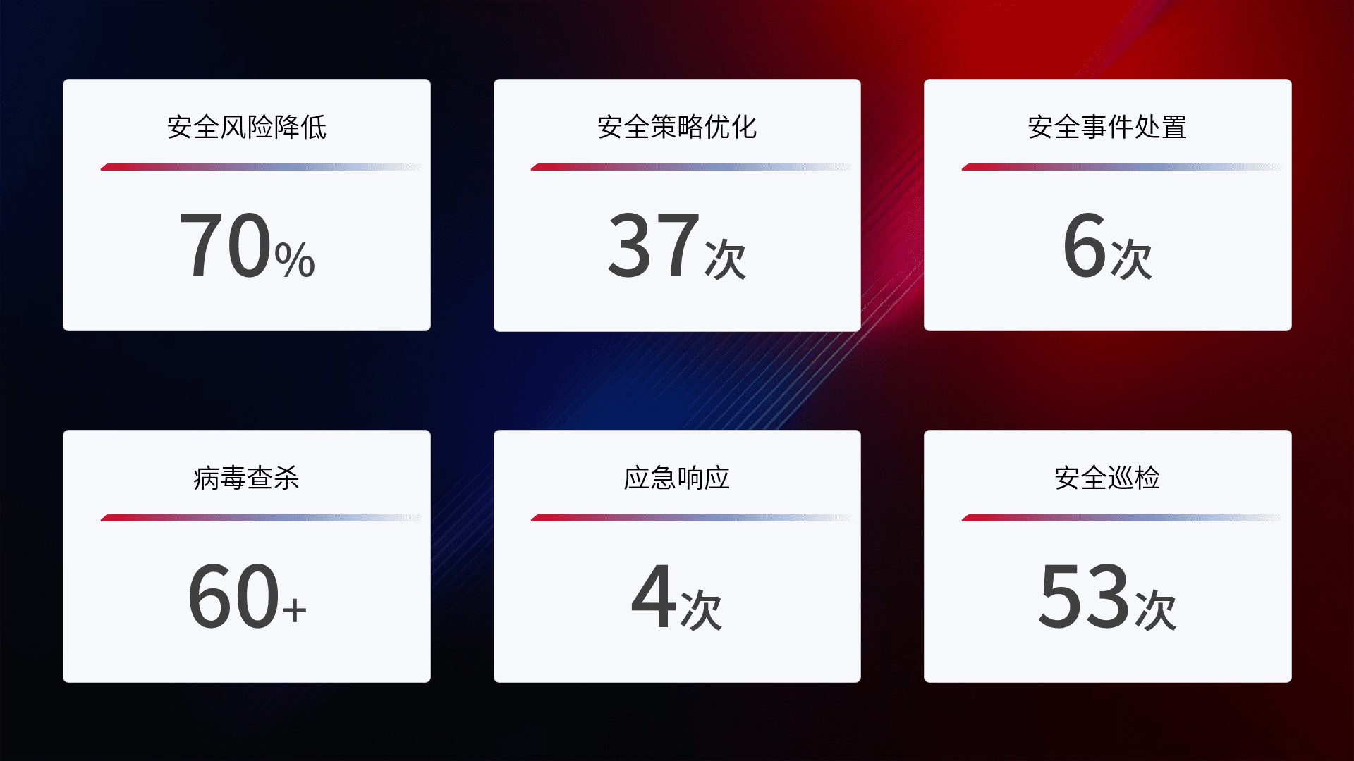 提供全面的安全事件报告体系,,,,包括处置报告、、、、周报、、、季度和年度总结,,,,结合持续监控,,帮助客户深入了解网络安全状况。。